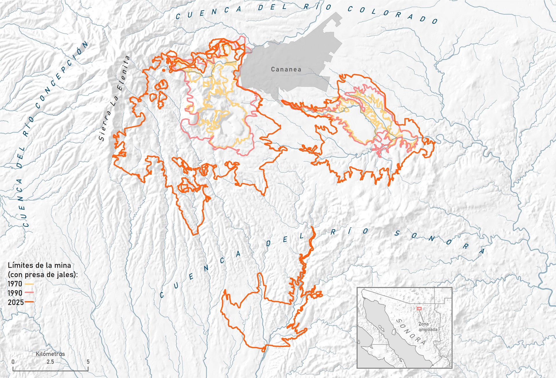 Desde que, gracias a las gestiones de Carlos Salinas de Gortari, dicha empresa se hizo de la propiedad de la mina en1990, la superficie en la que se registra destrucción ecosistémica se ha multiplicado por tres; en aquel año, los tajos a cielo abierto en la sierra ocupaban una superficie de 3,858 hectáreas, mientras que en 2025 los tajos se extienden por un área de 11,795 hectáreas. Si se comparan las extensiones de los tajos de 1970 —1,909 has.— y de 2025, observamos que en las últimas más de cinco décadas, la superficie devastada se ha multiplicado por seis.